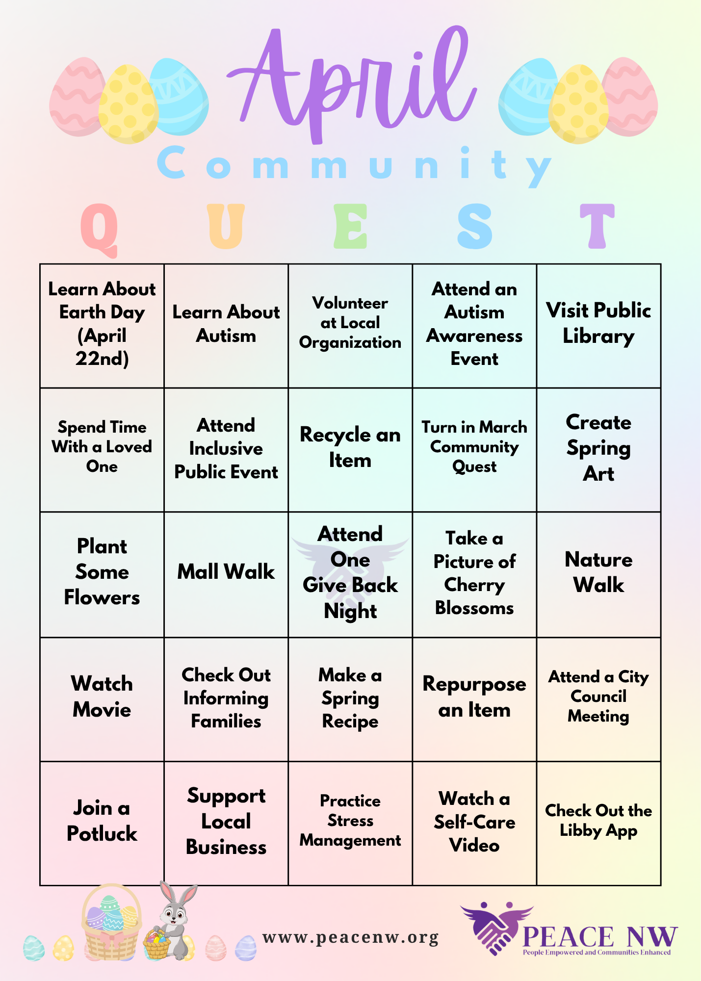 COMMUNITY QUEST CARD COMPLETION: If you complete a line, you can go to PEACE NW’s office to get a surprise. Completing the entire card will have you entered in a quarterly raffle.